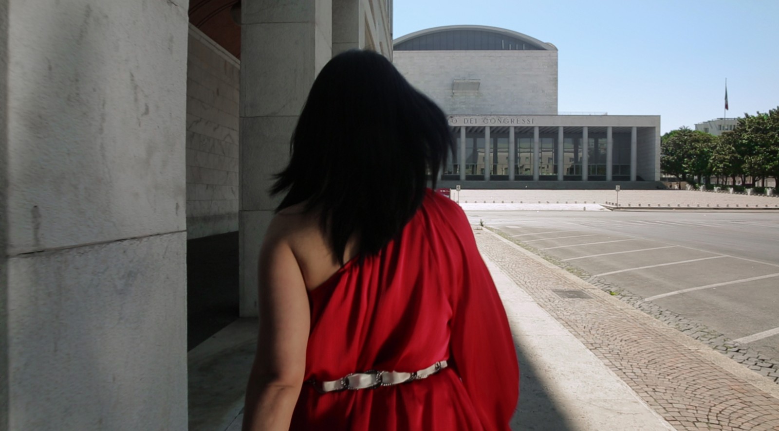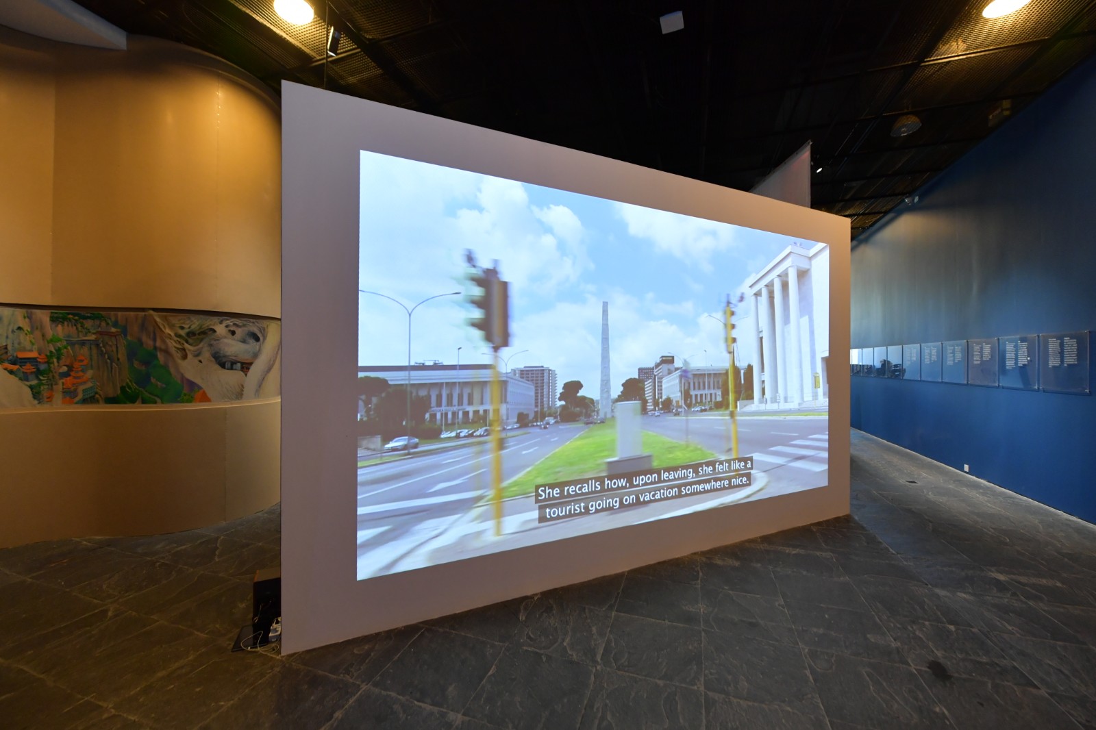 梅·海瑟格(Maj Hasager)《我們將在盲點(diǎn)相遇》是展覽呈現(xiàn)的最后一件作品,其講述了關(guān)于羅馬新城EUR區(qū)(Esposizione Universale di Roma)里的菲律賓移民的故事。這座由墨索里尼親自監(jiān)督設(shè)計的,以法西斯美學(xué)構(gòu)想出來的烏托邦城市,直至1960年才建成并被逐步被開發(fā)為羅馬新的富人區(qū)。海瑟格把眾多意大利導(dǎo)演在EUR區(qū)攝制的紀(jì)錄片、電影所刻畫的城市公共記憶,與這群定期在市中心一座教堂的地下室聚會的移民社群一同放入她的影像作品中,影像記錄了這個群體的閑暇時光,以一種個人的、私密的視角探索了菲律賓移民的私人記憶與生活如何融入并生存于這座有著強(qiáng)大歷史記憶的城市之中。正如約翰·伯格(John Berger)在《第七人》中的論述:“兩群不同的人在任何情況下,永遠(yuǎn)都是共性大于差異性的。只是由于種種原因,環(huán)境蒙蔽了人們的眼睛。”[7]我們看得見的是歷史的記憶碾壓而過留下的軋痕以及其帶來的城市變遷,而看不見的是居于其中的人是如何在此種變遷中安放自我的記憶與故事。從這個立意來看,展覽所討論的議題似乎又回溯到了“公共”與“私人”,“歷史”與“記憶”之間的連接,然而涉及的場域已經(jīng)擴(kuò)展到了一個城市或是一種文化以外。