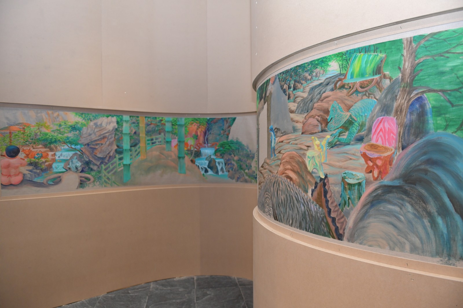 “地洞”一旁是展廳的下沉區(qū)域,這里被策展人設(shè)計為去往“桃花源”的實(shí)體路徑。梁碩的《景了個區(qū)》出現(xiàn)在這個下沉空間的一排四個口袋式的連續(xù)隔間墻面上,從空間上來說是無比契合的?;仡櫫捍T2019年在北京公社的展覽《梁碩:景區(qū)》同樣可以見到這樣一種迂回的觀展路徑?!熬皡^(qū)”這個概念的提出,在藝術(shù)家看來代表著今天人們對山水的理解,這個獨(dú)特的概念跨越了自然景觀與都市空間。梁碩在自己撰文的《景了個區(qū)》中復(fù)原了一個景區(qū)籌備建立起來的小故事,承包景區(qū)改造的劉工在工期接近尾聲時,看到自己的“杰作”時不由感嘆:“這些水泥造物,居然都妥妥的在那了,像是本來就是從山里長出來的,那巨大的假山石和假樹根顯得造型怪異,卻頗得陳老蓮氣韻,在落日的余暉中與真山融為一體,真山也像了假山……”[6]景區(qū)的建立勢必意味著人工、商業(yè)、消費(fèi)對自然景觀的直接侵入與改造,空間、審美、意識形態(tài)等一系列問題由此發(fā)生。