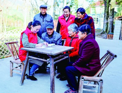 浙江長興縣和平鎮(zhèn)方家莊村便民服務(wù)中心志愿者為村里老人上門辦理第三代社??〒Q證業(yè)務(wù)。新華社發(fā)