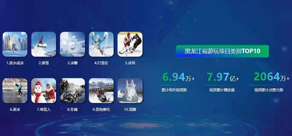 這些游客大部分選擇在冬季來到黑龍江,欣賞冰天雪地。冬季游玩項目是外地游客來黑龍江的源動力,2020年,黑龍江省游玩項目類短視頻TOP10中,潑水成冰類視頻深受用戶的喜愛,排在第一位,其次分別是:滑雪、冰雕、打雪仗、冰球、滑冰、堆雪人、冬捕、雪地摩托、雪雕等,所有游玩項目類視頻累計相關視頻數6.94萬+、播放量7.97億+、點贊次數2064萬+。
