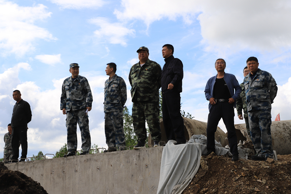 阿木爾林業(yè)局黨委書(shū)記胡守慶(中)深入到楚龍溝大橋,查看水情變化。