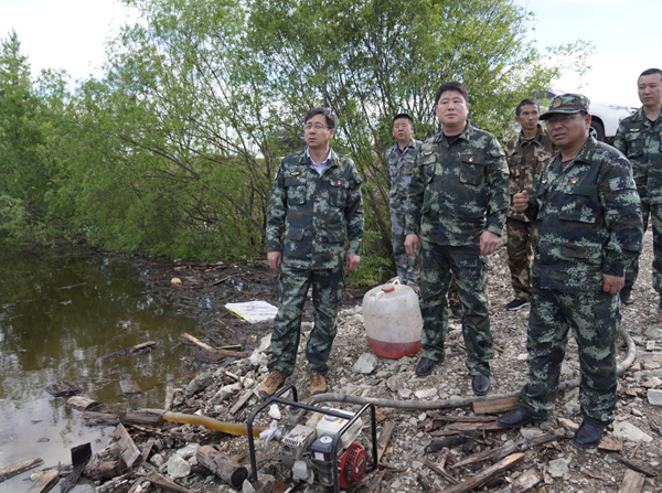 阿木爾林業(yè)局黨委副書(shū)記、局長(zhǎng)韓鳳泉(左一)深入到向陽(yáng)街查看排內(nèi)澇情況