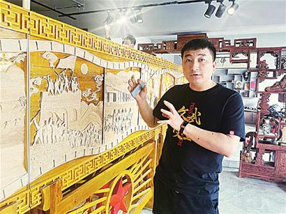 近年來(lái),李寶峰大膽嘗試,在傳統(tǒng)木雕作品的基礎(chǔ)上不斷創(chuàng)新,懷著對(duì)黨的感恩和對(duì)家鄉(xiāng)的熱愛(ài),不斷將作品注入紅色元素,積極探索設(shè)計(jì)創(chuàng)作具有時(shí)代氣息的木雕作品,用刀木刻畫春秋、記錄時(shí)代變遷。