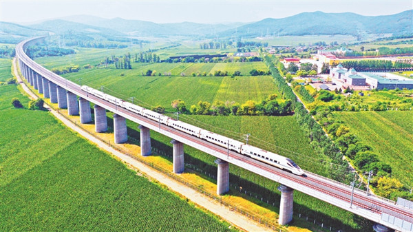 牡佳高鐵試運(yùn)行列車通過集賢縣小安邦河2號特大橋。
