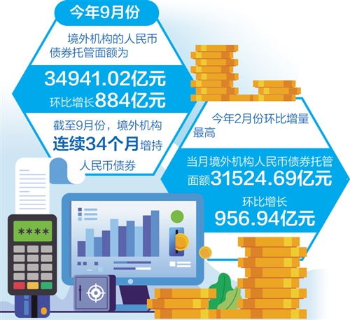 境外機構對人民幣債券熱情持續(xù)高漲。數(shù)據(jù)顯示,9月份境外機構人民幣債券托管面額為34941.02億元,較8月份增加884億元,環(huán)比增量創(chuàng)今年3月份以來新高。截至9月份,境外機構已連續(xù)34個月增持人民幣債券。