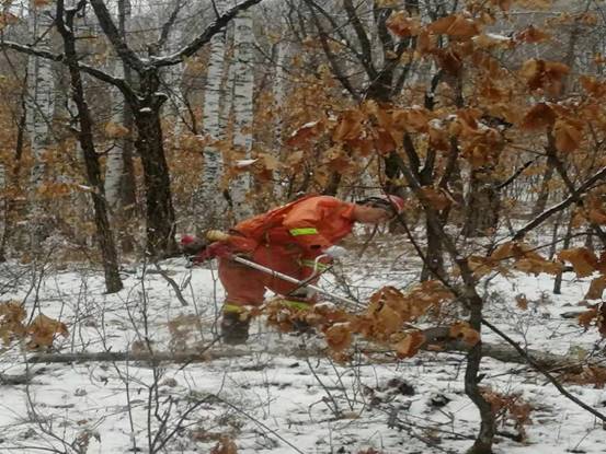 在經(jīng)過(guò)一段緊張嚴(yán)格的產(chǎn)前技能及安全培訓(xùn)后,紅星林場(chǎng)職工們備齊生產(chǎn)工具和防護(hù)物品,每天頂著未褪盡的夜色出發(fā),天剛冒亮就開(kāi)工,在積雪覆蓋的林間不停穿行,鋸手手持割灌機(jī)把作業(yè)規(guī)程要求的各類(lèi)林內(nèi)枯死、風(fēng)折枝干伐除,后面的歸堆工緊隨其后,把割下的枯干枝條有序的理順碼成堆。各小組分工明確,配合嫻熟,漫山雜亂的倒木藤條在工人們的手下被梳理的清晰利落,寂靜的山林也在機(jī)器的轟鳴和工人們的笑聲中熱鬧起來(lái)。