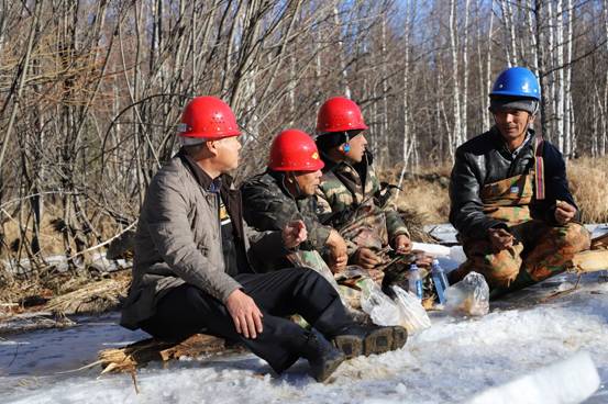 阿木爾林業(yè)局多種經(jīng)營(yíng)公司干部職工在修復(fù)水毀橋時(shí)利用歇息時(shí)間研究下步工作(王力 攝)