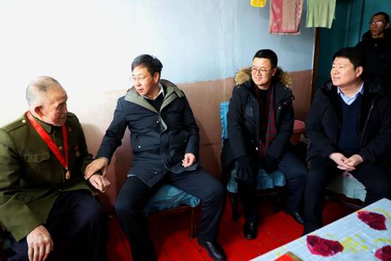 阿木爾林業(yè)局黨委副書記、局長韓鳳泉(左二)走訪慰問抗美援朝老戰(zhàn)士、退休老黨員張俊峰(左一)(王力 攝)