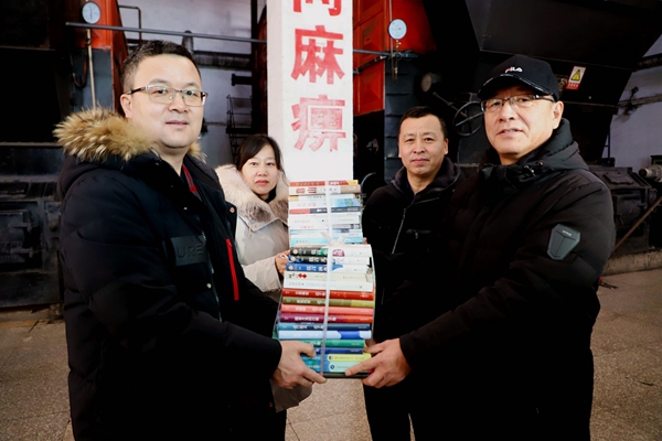 阿木爾林業(yè)局黨委委員、宣傳部部長(zhǎng)高樹源(左一)為物業(yè)公司送書籍的精彩瞬間(王力 攝)