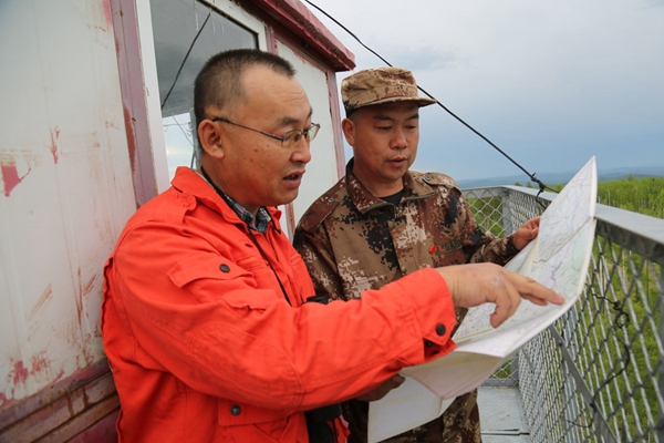 孫立森在向長山林場黨支部書記關大安介紹塔周圍的地形、地勢、河流等特點,以及周邊瞭望塔的分布情況(王力 攝)