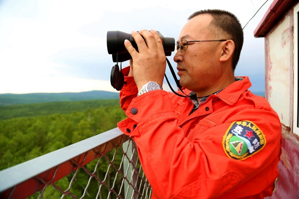 阿木爾林業(yè)局“阿16”防火瞭望塔瞭望員孫立森密切關注周圍森林資源安全(王力 攝)