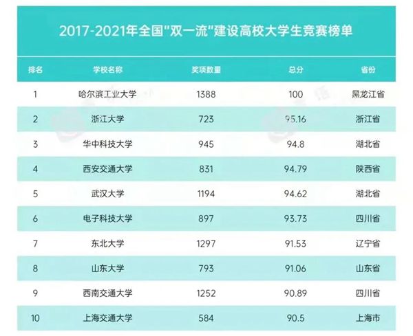 在同時(shí)發(fā)布的2017—2021年全國(guó)“雙一流”建設(shè)高校大學(xué)生競(jìng)賽榜單和全國(guó)理工類(lèi)本科院校大學(xué)生競(jìng)賽榜單中,哈爾濱工業(yè)大學(xué)均列榜首。
