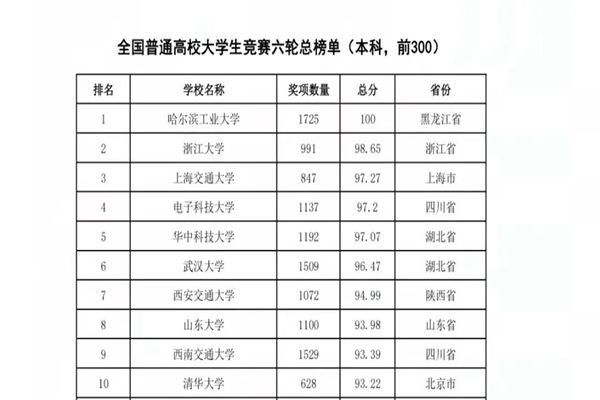 哈爾濱工業(yè)大學(xué)以獲獎(jiǎng)數(shù)量1725項(xiàng)、總分100分的絕對(duì)優(yōu)勢(shì)獲得全國(guó)普通高校大學(xué)生競(jìng)賽六輪總榜單冠軍。