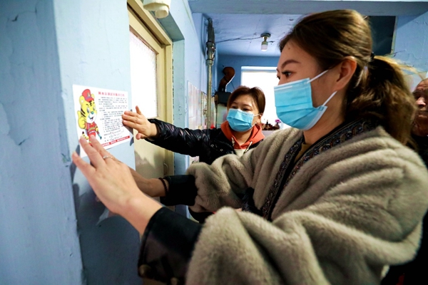 阿木爾社區(qū)志愿者王春草(右)、李建靜(左)走進居民周家讓家中,提醒居民注意防火,并在醒目處張貼《防火公約》(王力 攝)