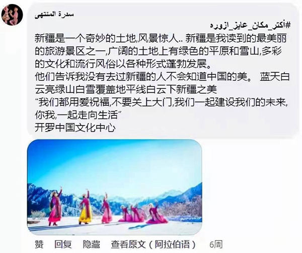 其中,來(lái)自埃及曼蘇拉的西德拉·蒙塔哈獲得本次活動(dòng)的“最佳評(píng)論獎(jiǎng)”。她在中心帖文下多次留言,“新疆風(fēng)景迷人,是最美的旅游勝地之一。在廣袤的土地上有草原和雪山,沒(méi)有去過(guò)新疆的人,就不會(huì)知道中國(guó)的美……我想去那里滑雪、騎馬?!绷硗?,她還想去北京吃炸醬面,去遼寧泡溫泉等。