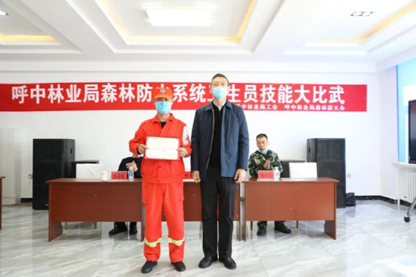 呼中林業(yè)局黨委書(shū)記魯智勇為“大比武”一等獎(jiǎng)?lì)C獎(jiǎng)(孫樹(shù)輝 攝)