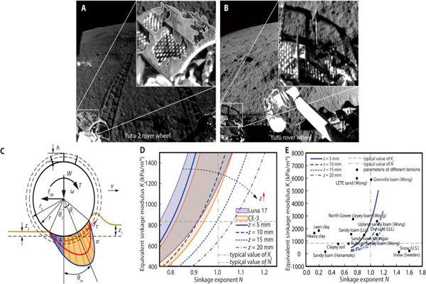 團(tuán)隊(duì)成員根據(jù)月球車車輪與月面作用的信息和地面力學(xué)模型估計(jì)了月壤的力學(xué)特性,結(jié)果表明,月壤風(fēng)化層的承壓特性與地球上的干沙和沙壤土類似,與美國(guó)阿波羅計(jì)劃中的典型月壤相比具有更強(qiáng)的承壓特性。在多個(gè)不同地點(diǎn)的圖像中,觀察到“玉兔二號(hào)”車輪粘附有大塊團(tuán)狀土壤,而“玉兔號(hào)”車輪基本不存在粘土現(xiàn)象,這表明,嫦娥四號(hào)著陸區(qū)附近月壤內(nèi)聚力較大,其原因可能是包含較高比例的凝集物,使土壤顆粒經(jīng)車輪碾壓更易團(tuán)聚。