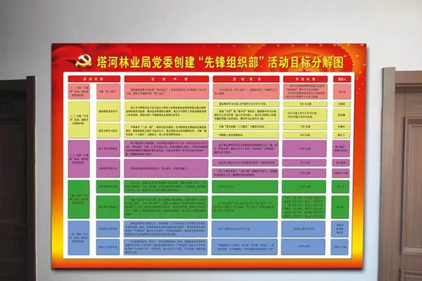 掛圖“作戰(zhàn)”,統(tǒng)籌指導(dǎo)。塔河林業(yè)局黨委組織部結(jié)合自身實際制定了《塔河林業(yè)局黨委創(chuàng)建“先鋒組織部”實施方案》;緊緊圍繞集團(tuán)黨委下發(fā)方案中的“五大”活動和九項具體工作內(nèi)容制定目標(biāo)分解展示圖,詳細(xì)列出了活動內(nèi)容、活動要求、完成時限,秉承誰具體負(fù)責(zé),誰統(tǒng)籌推進(jìn),誰跟蹤問效的的原則,將責(zé)任落實到人頭,時刻督促每名組工干部及時完成目標(biāo)任務(wù),凝心聚力,共同打造講政治、重公道、業(yè)務(wù)精、作風(fēng)好的組工干部隊伍。