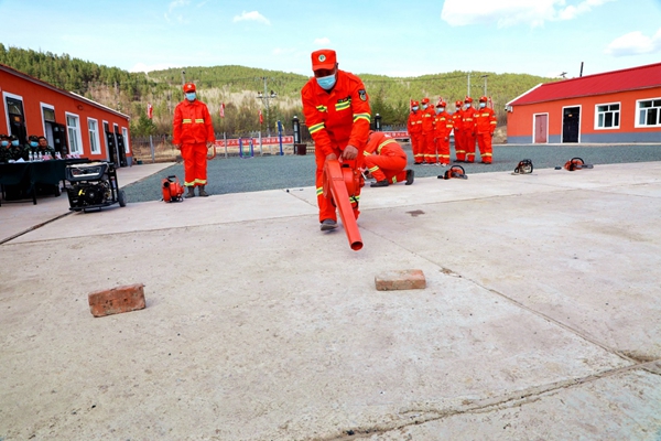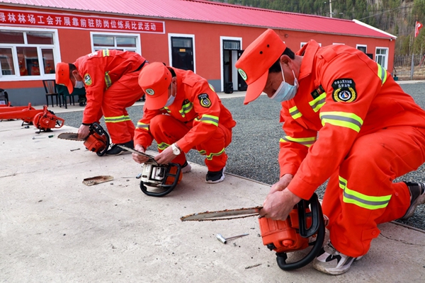 阿木爾林業(yè)局綠林林場專業(yè)撲火隊員在進行風(fēng)力滅火機、油鋸的拆裝維修使用比賽(王力 攝)