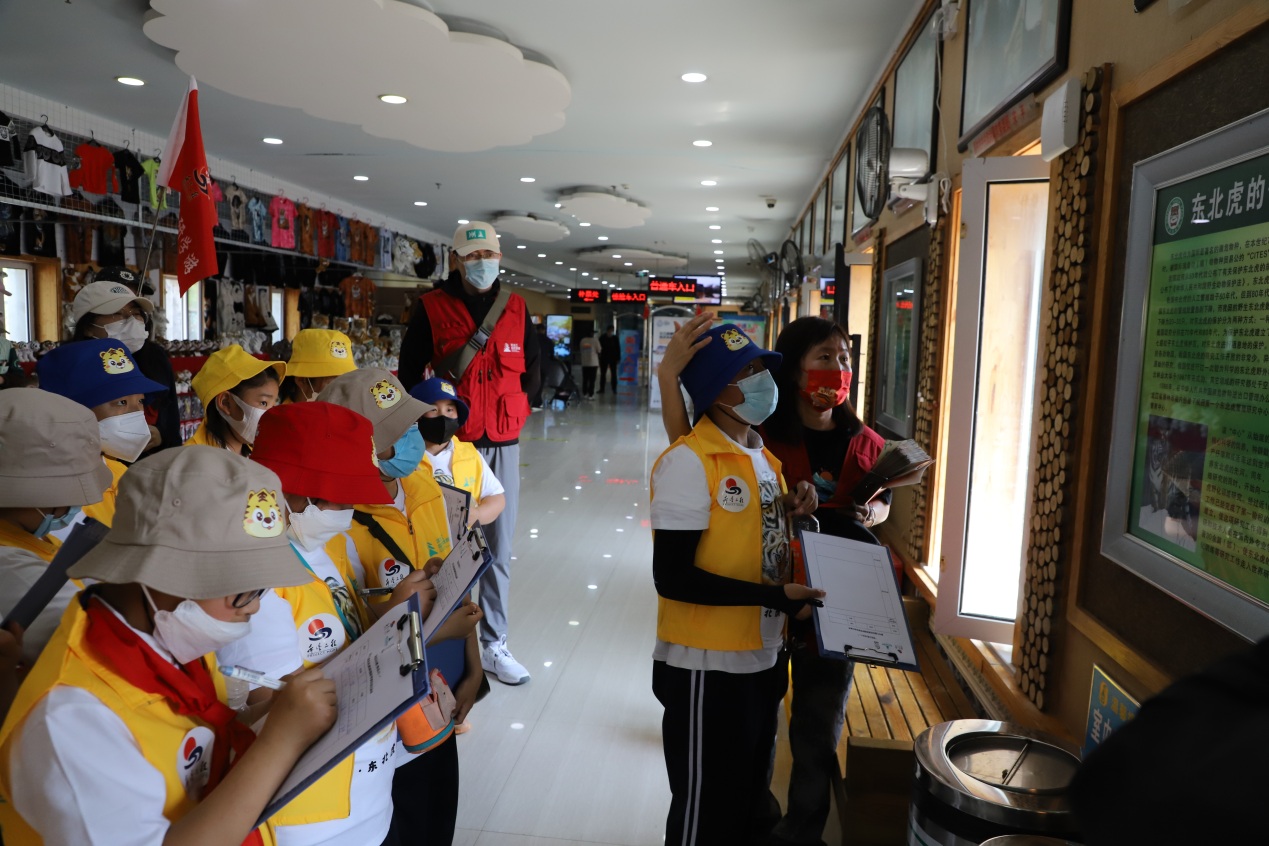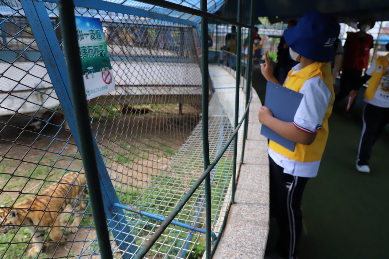 在東北虎林園工作人員的帶領(lǐng)下,小朋友們穿著統(tǒng)一的黃馬甲,手持研學(xué)游活動記錄單,充滿期待地走進(jìn)東北虎林園,近距離觀察動物們的外貌特征、動作特點(diǎn),細(xì)致聆聽工作人員的講解,認(rèn)真記錄自己所看到的每一個(gè)細(xì)節(jié)、聽到的每一個(gè)知識,還有愛畫畫的小朋友畫下了自己親眼所見的老虎憨態(tài)可掬的樣子。