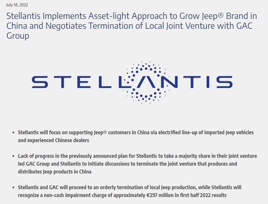 7月18日,Stellantis集團發(fā)布公告稱,正在與廣汽集團協(xié)商終止合資公司廣菲克的經(jīng)營,并將有序停止Jeep品牌的國產(chǎn)化;未來,Stellantis將通過進口的方式獨自在中國銷售、經(jīng)營Jeep產(chǎn)品。