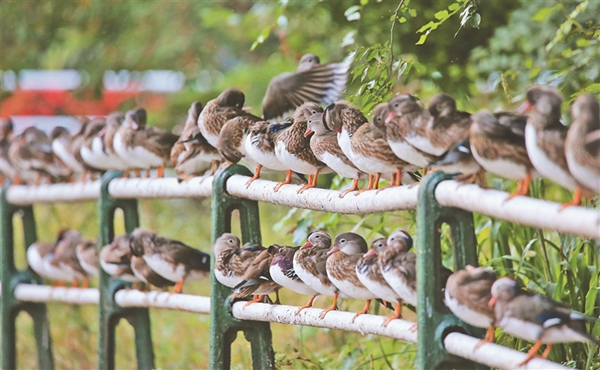 13日,哈爾濱市兆麟公園鴛鴦湖邊,近300只野生鴛鴦在湖邊欄桿上休息,密密麻麻排出近百米的“長(zhǎng)龍”。公園專職看護(hù)鴛鴦的職工車春虎介紹,目前在公園內(nèi)及周邊出生的小鴛鴦已經(jīng)長(zhǎng)大,加上從周邊濕地飛來的鴛鴦,每天早晚來鴛鴦湖覓食的鴛鴦數(shù)量接近300只,這一數(shù)量還在持續(xù)增長(zhǎng)?!邦A(yù)計(jì)國(guó)慶節(jié)前后,數(shù)量能超400只?!?/span>