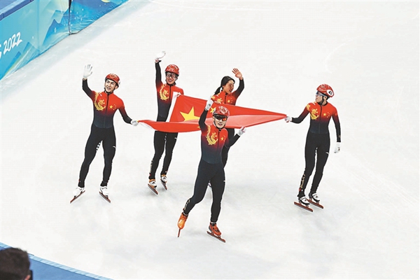 北京冬奧會短道速滑混合團(tuán)體接力中國隊(duì)摘金。