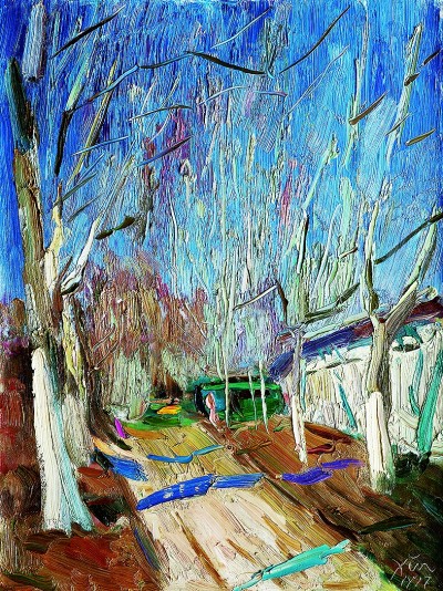 在諶北新的代表性作品里,無論何種結(jié)構(gòu),色調(diào)、筆觸、造型、線條都可以獨(dú)立觀賞。一塊厚堆的白色顏料,可以是云朵、是白墻,或是前后重疊的船帆。用筆的疏密、狀貌和節(jié)奏都有獨(dú)立存在的意義,既可以像欣賞書法用筆一樣拋開物象去體味,又可以去想象和填補(bǔ)與之恰合的物象和自然關(guān)系。諶北新對(duì)書法的深入研究和長期的繪畫寫生,以及他對(duì)物象、空間、色彩關(guān)系的觀察與創(chuàng)造實(shí)踐,使其作品能夠?qū)⒉煌谋憩F(xiàn)手法有機(jī)地融為一體。比如一筆畫下去,既表現(xiàn)空間層次,也體現(xiàn)厚薄輕重,同時(shí)展現(xiàn)光線的微妙變化。這種綜合性的呈現(xiàn)效果,實(shí)際上也契合著中國山水畫所追求的通過用筆的輕重緩急,通過虛實(shí)濃淡的墨色渲染,通過遠(yuǎn)近高低的畫面布局,表現(xiàn)山水對(duì)人的情感與心靈的影響。而諶北新的風(fēng)景油畫,正是基于中國人對(duì)山川草木的喜愛之情,通過體察和探求提煉出的獨(dú)特意象,它符合現(xiàn)代人的心理需求,也呼應(yīng)著畫家畢生追求的藝術(shù)境界——須其自來,不以力構(gòu)。