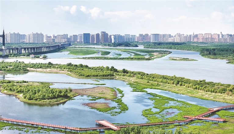 近日,初夏的松花江碧水清清、綠意盈盈,一塊塊大大小小的濕地星羅棋布,宛如一顆顆珍珠散落在松花江兩岸。傍晚,落日熔金,夕陽余暉映云成霞,游船悠悠,鷗鳥翩翩,江景如畫。
