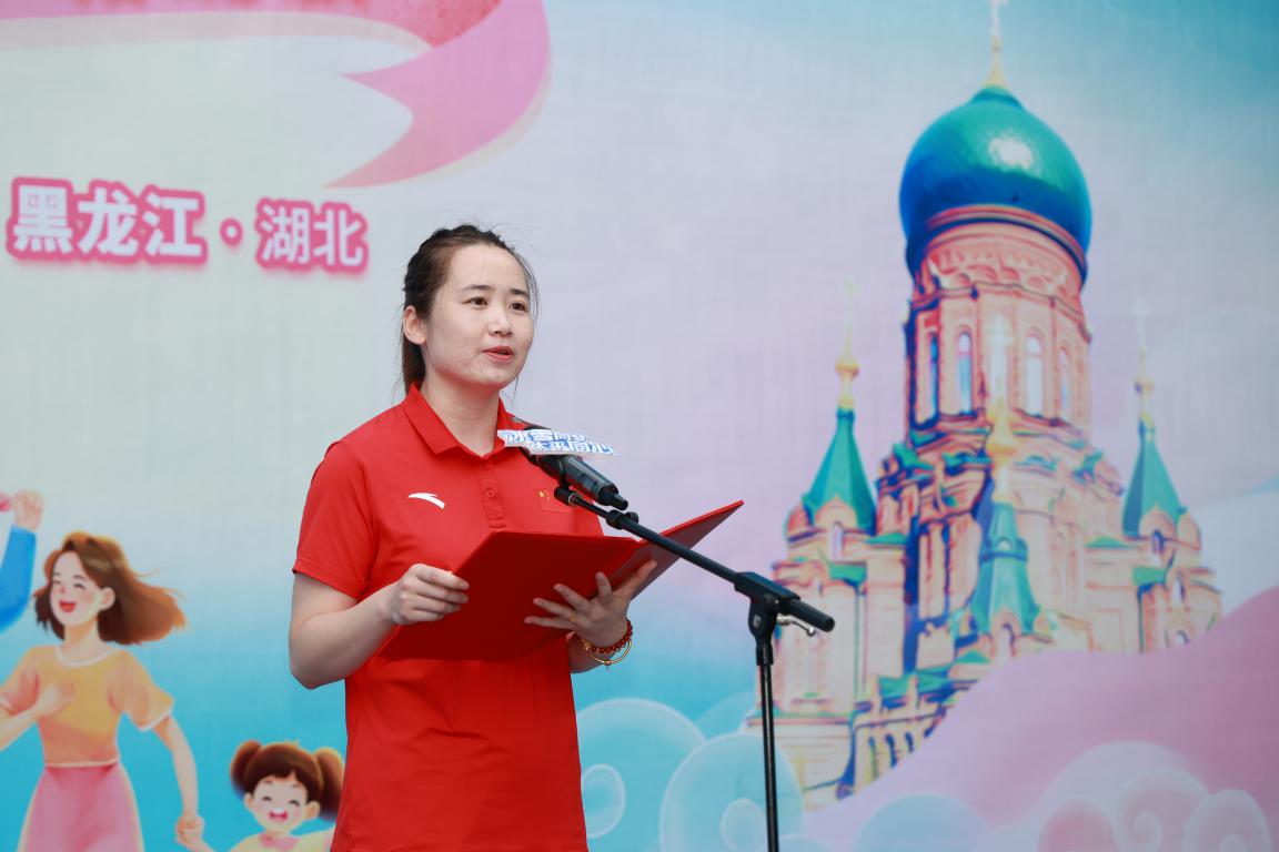 短道速滑世界冠軍孔雪進行冠軍寄語??籽┍硎荆饺藟凼且患覟閲鵀槊竦钠髽I(yè),與她為國爭光的目標一致,作為一名6歲起就接觸滑冰的專業(yè)運動員,她曾經(jīng)經(jīng)歷了很多挫折與傷病,是為國爭光的使命感和給家人美好生活的信念推動著她不斷前行。她用自身經(jīng)歷鼓勵小朋友要有為夢想拼搏的勇氣,希望小朋友抓住每一次鍛煉的機會,將運動精神傳遞下去。在孔雪的帶動下,千余人共同喊出了“太平好少年,一起向未來”的口號,響徹園區(qū)。