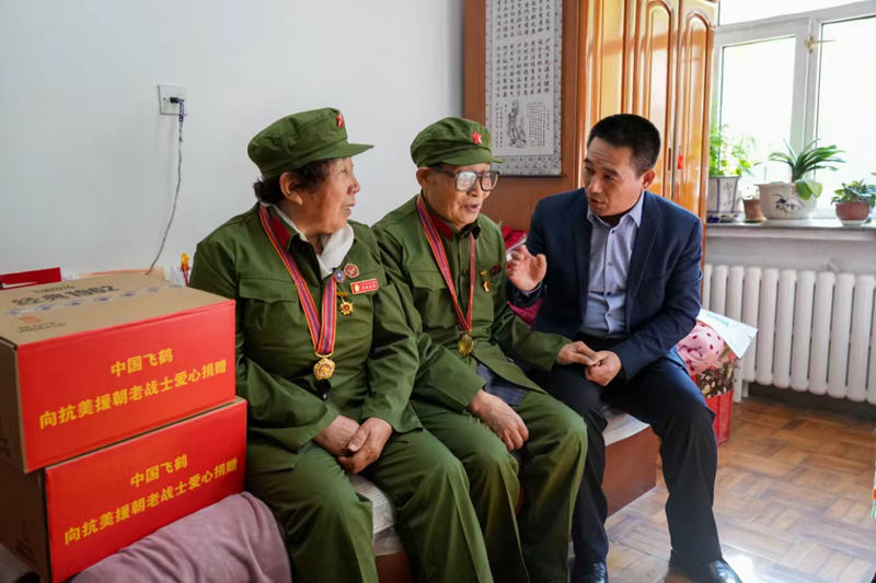 飛鶴乳業(yè)黨委書記朱天龍(右)帶領工作人員看望抗美援朝老戰(zhàn)士