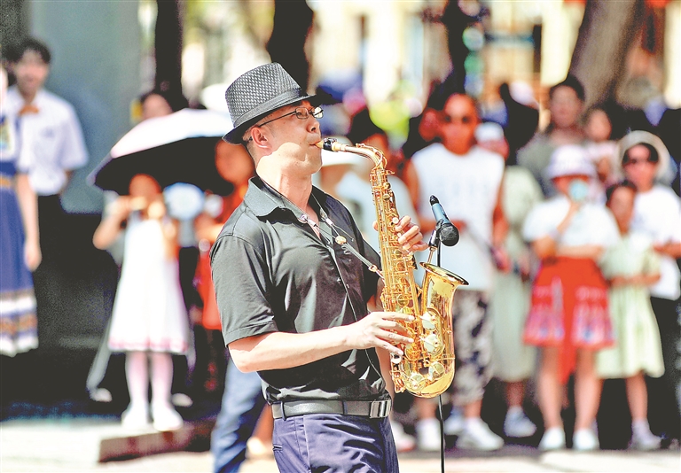日前,哈爾濱市道里區(qū)中央大街與紅專街交口處,多位藝術家現場為人們表演,吸引許多游客圍觀。琵琶、薩克斯、手風琴等樂器演奏的經典樂曲,博得人們陣陣掌聲。美妙的旋律回蕩在街道上空,為百年老街增添了更多的藝術魅力。