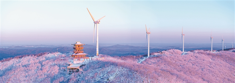 山林間云霧彌漫,白雪和蒼勁的虬枝映襯,山頂的天佑閣和一個個白色巨人般的發(fā)電“風車”相映成趣,將這座名山裝扮得更加素雅、更顯活力。近處,松柏全都凝霜掛雪,戴銀披玉。山頂原始次森林中,低矮的灌木叢也被積雪覆蓋,成為了一朵朵五彩的冰花。高大的樹木被輕盈的雪花點綴,晶瑩剔透,仿若玉樹瓊枝,隨風搖擺,宛如仙境。