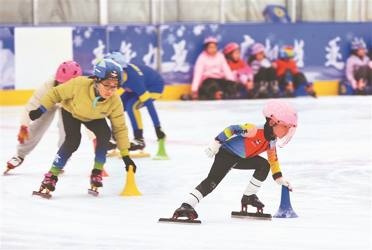 2日,哈爾濱市道里區(qū)冰上運動中心氣膜冰場內(nèi),百余名中小學(xué)生正在練習(xí)滑冰。