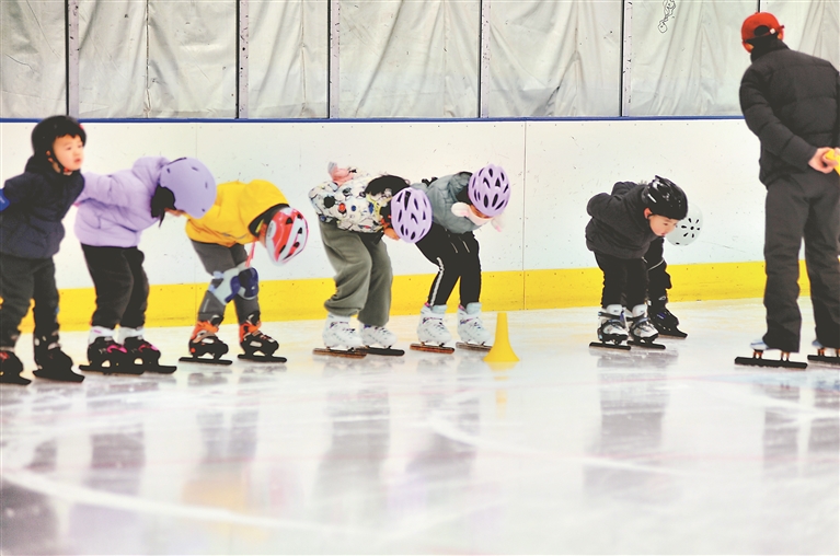 孩子們分成多支隊伍,有的在場邊學(xué)習(xí)基本動作,有的在冰場中間練習(xí)彎道滑行,教練在旁細心指導(dǎo)。