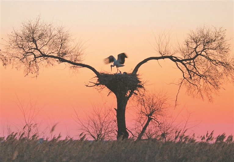 圖為東方白鸛筑巢孵卵。本報(bào)記者 郭俊峰攝