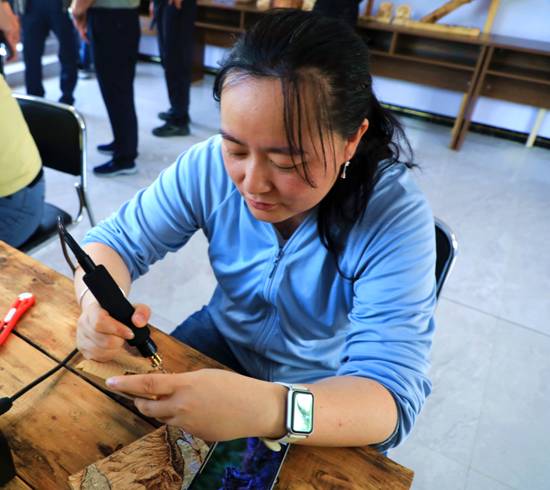 阿木爾林業(yè)局“嶺上有禮”文創(chuàng)工作室鐘婧麒專心致志創(chuàng)作燙畫作品(王力 攝)