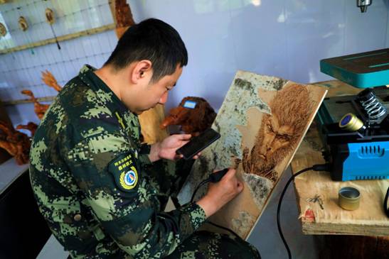 阿木爾林業(yè)局“嶺上有禮”文創(chuàng)工作室李壯正在創(chuàng)作作品(王力 攝)