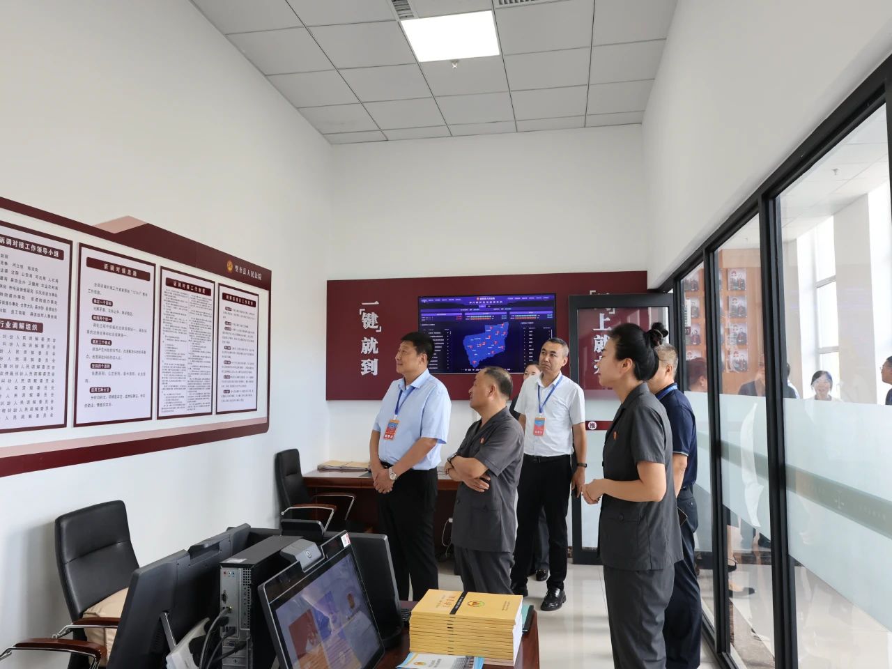 視察組一行首先實地查看了縣法院訴訟服務(wù)中心、訴調(diào)對接中心、多元解紛指揮中心、特邀調(diào)解室、人民調(diào)解員調(diào)解室、行業(yè)調(diào)解室等場所,通過現(xiàn)場察看、翻閱資料、與一線調(diào)解員和法官深入交流等方式,詳細(xì)了解了從調(diào)解受理、司法確認(rèn)到訴訟流轉(zhuǎn)的全鏈條多元解紛工作流程以及縣法院構(gòu)建的“1+N”訴調(diào)對接格局、打造的“先行調(diào)解+司法確認(rèn)”模式、建設(shè)的“一點五站”多元解紛體系、探索的“五維五講”聯(lián)動調(diào)解法和總結(jié)的“四不四可以”先行調(diào)解優(yōu)勢等多元解紛工作情況。