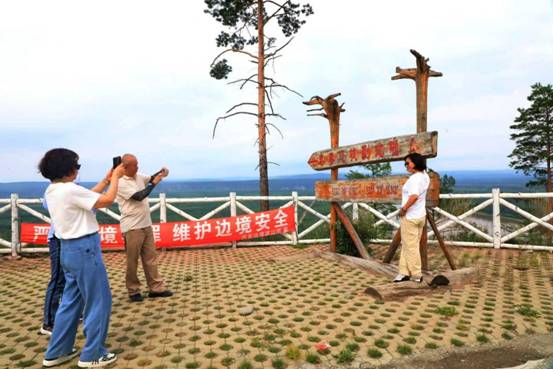 大慶游客在阿木爾林業(yè)局東出口路的“找北從這里開始”標(biāo)識(shí)前合影(王力 攝)
